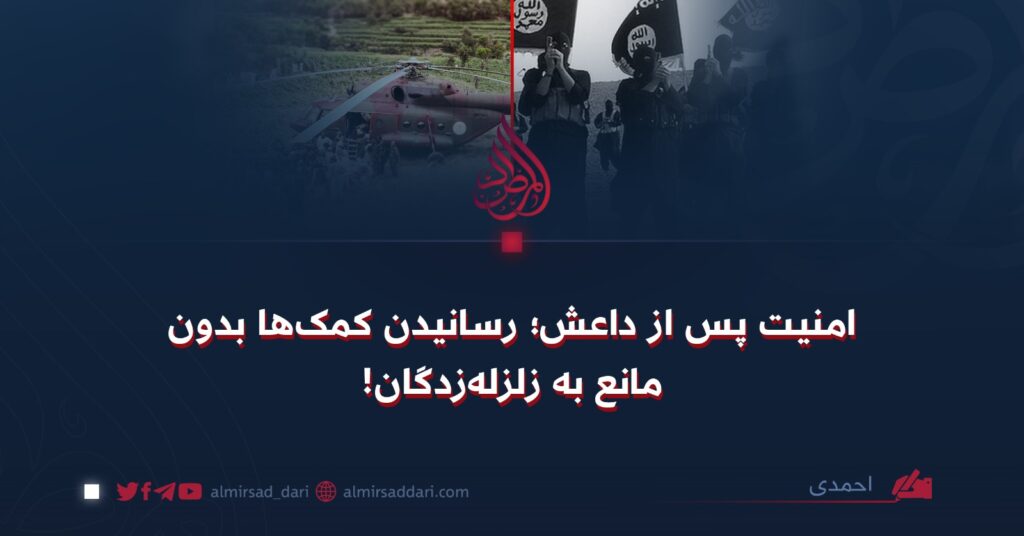 اما امروز به برکت حاکمیت امارت اسلامی و امنیت کامل موجود؛ کمکها از سراسر کشور حتی از ولایتهای دوردست بدون هیچگونه مانعی به دست آسیبدیدگان میرسد، با آنکه در برخی مناطق زلزلهزده راههای ارتباطی بهسبب زلزله مسدود شده بود؛ تیمهای امدادی توانستند با امنیت کامل و بدون هیچ تهدیدی از جانب داعش خود را به دورترین مناطق برسانند.