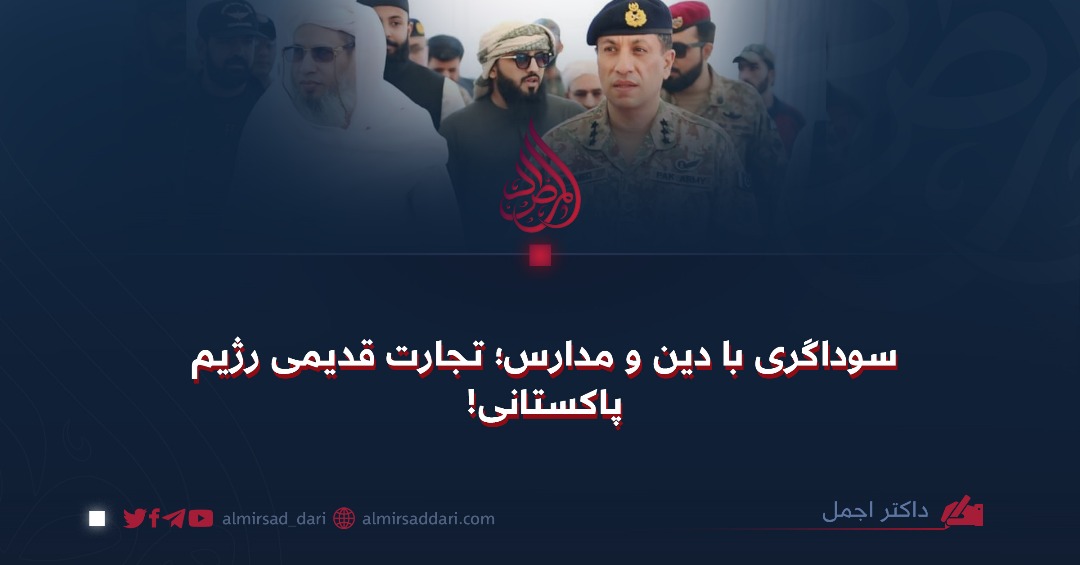 سوداگری سیاسی رژیم پاکستان بر سر ارزشهای دینی و مدارس خودساخته امر تازهای نیست. دیکتاتورهای نظامی حاکم بر این کشور و برکنارکنندگان دولتهای مردمی همواره کوشیدهاند برای حفظ قدرت، منافع شخصی و معاملات با ستمکاران جهانی از دین نیز استفادهی نابجا داشته باشند. مفتیان و مدارس خودساخته تأسیس نموده و سپس آنان را برای جلوهی دینی دادن به دیدگاهها و سیاستهای سکولار خود به کار میگیرند. آخرین نمونهی آن، تقدیر و تمجید مفتیان جامعهی رشید از همان نظامیان و مقامات نظامی بود که دستانشان به خون ملت خود و صدها بیگناه آغشته است و شبانهروز در خدمت بیگانگان برای تروریسم جهانی، داعش و سایر فتنهها مشغول اند.
