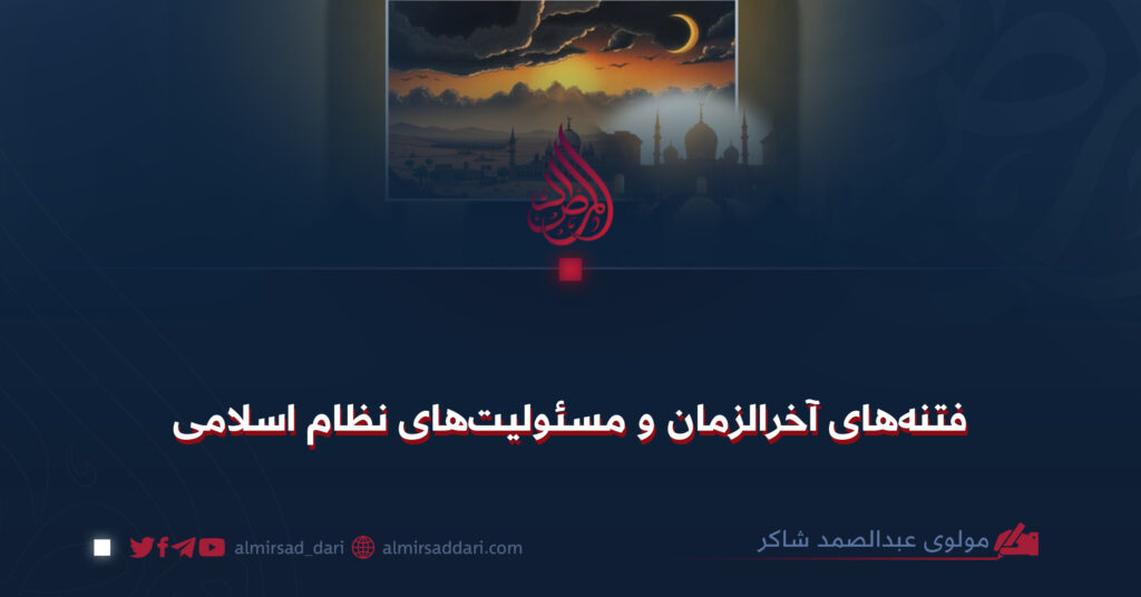 زمانهٔ آخر است؛ در دوران پایانی خویش به سر میبرد. آمدن رسول الله صلی الله علیه وسلم خود نشانهای از قیامت و آخر زمان است. ما در این نوشتار در پی آنیم که نشانههای آخرالزمان و فتنههایی که در عصر حاضر پدیدار گشتهاند کدام اند و در برابر آنها، مسئولیتهای نظام اسلامی چیست؟